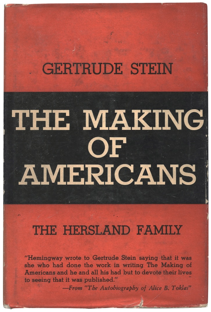 Höjdpunkten i Steins prosakonst är romanen The Making of Americans utgiven 1925. Hon menade att det var ”en berättelse om alla” genom att den gestaltade människoblivandets problem i moderniteten. I likhet med Prousts På spaning efter den tid som flytt handlar boken mer om själva romanskrivandet än om karaktärerna. Höjdpunkten i hennes diktning är Stanzas in Meditation som skrevs mellan åren 1929 och 1933 men publicerades först postumt 1956. Dikterna utforskar varseblivningens och skrivandets villkor. Den svenska översättningen av Görgen Antonsson har titeln Mediterande strofer.