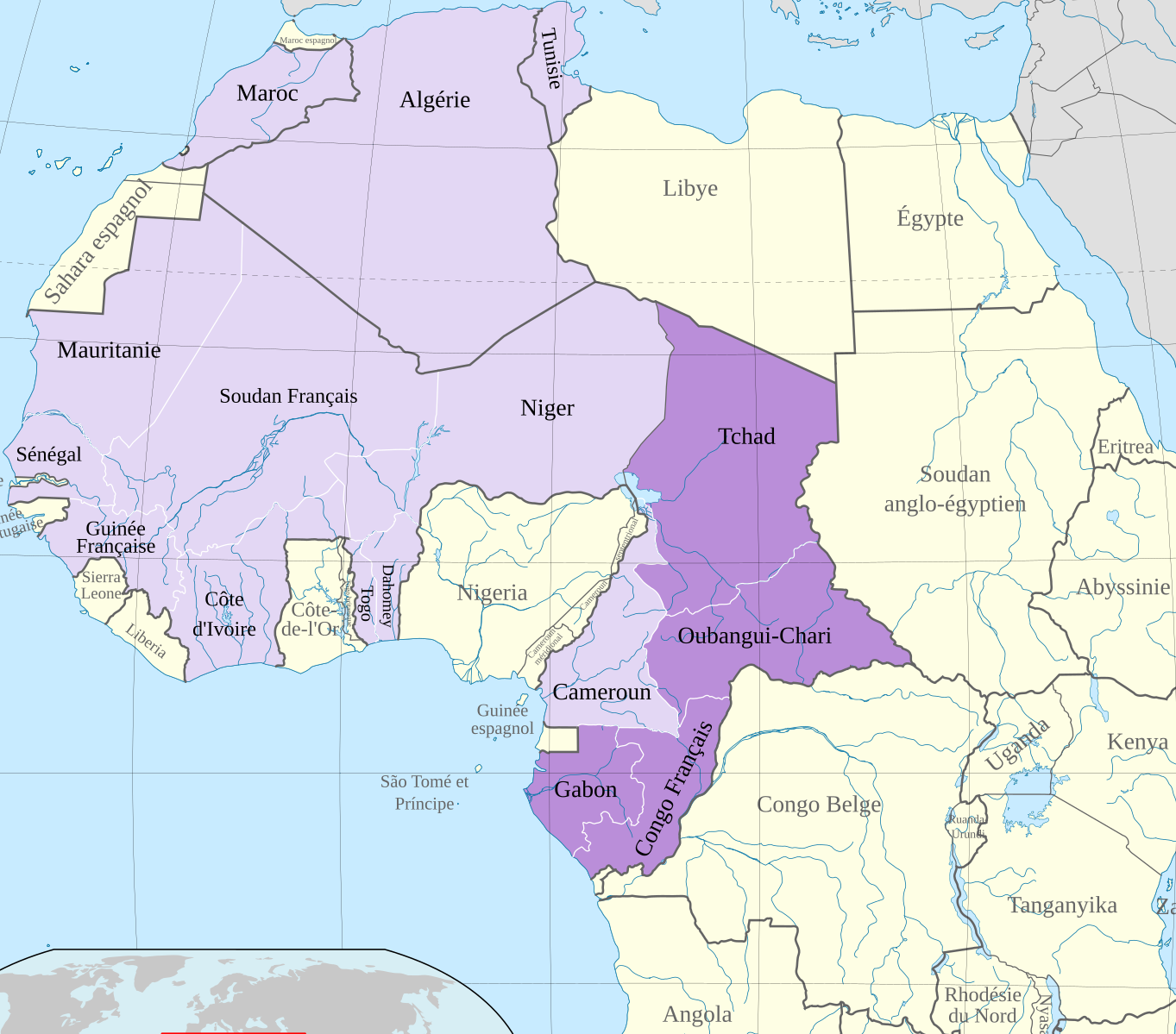 Franska kolonier i Västafrika 1935 med Franska Ekvatorialafrika markerat i mörkare lila (Wikimedia commons)