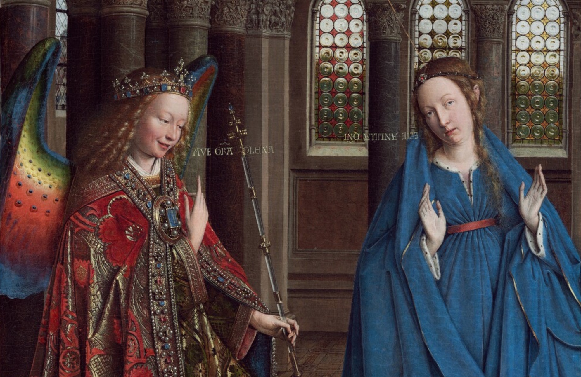 Ingen kan ta miste på Jan van Eycks intellektuella utförsgåvor. Hans måleri äger kanske inte den psykologiska laddningen som hos Rogier van der Weyden eller Hugo van der Goes, men han är i mina ögon den förste briljante minimalisten i konsthistorien, vilket särskilt bevisas här i det himmelska sändebudets minutiöst detaljerade praktmantel och skinande kristallstav.