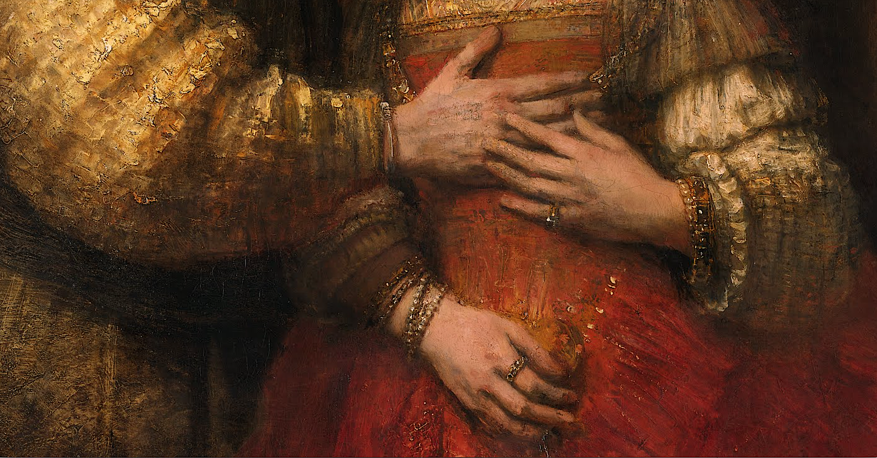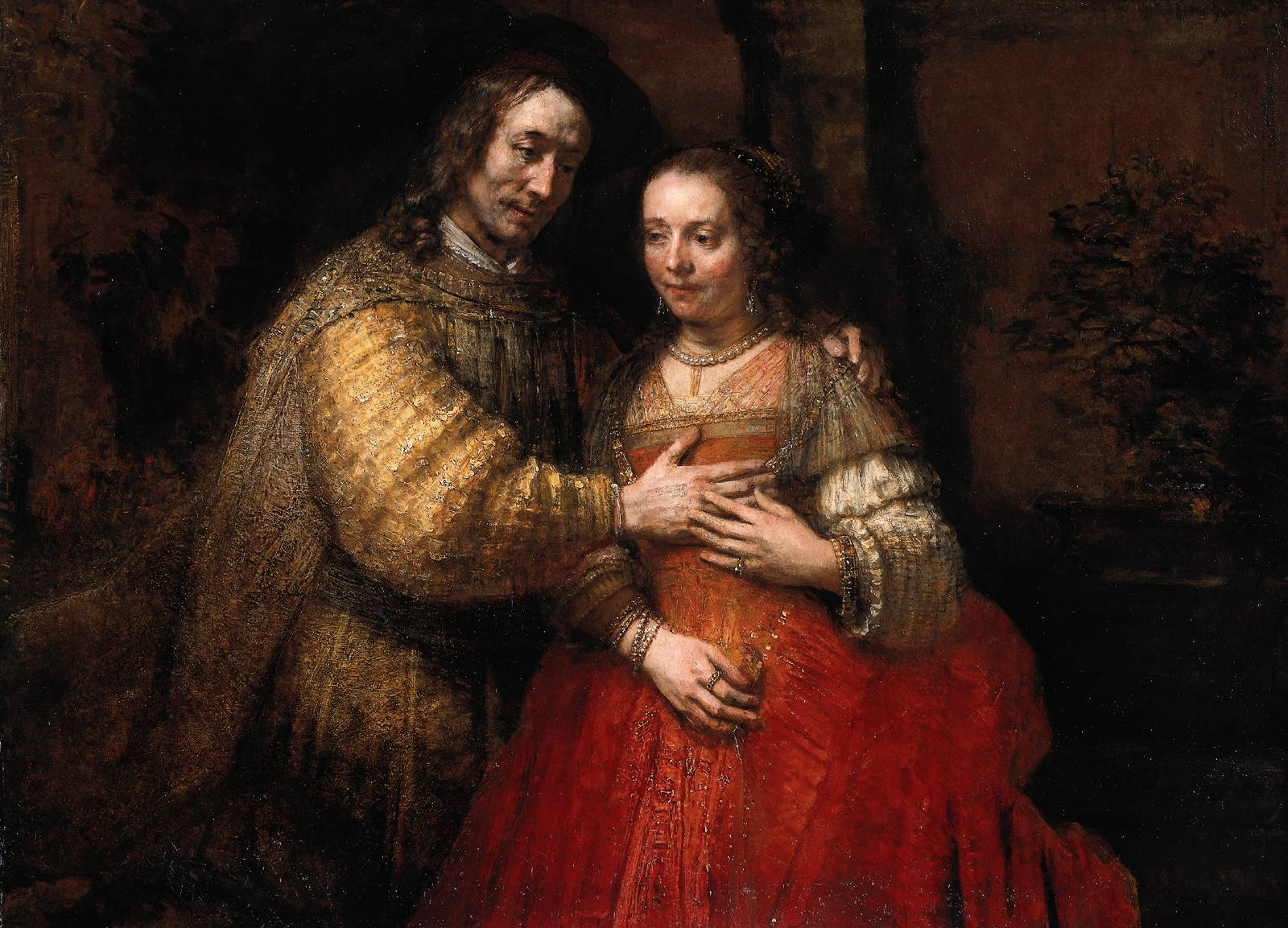 Där finns hos den åldrade Rembrandt ett ömtåligt presens bortom finmåleriets charm. Särskilt så i Den judiska bruden från 1663 där betraktaren måste sväva i ovisshet om vem som är vem – om det är brudgummen som smeker bruden eller fadern som välsignar dottern. Hon är smyckad med ett halsband, en ring, med örhängen och armband. Den bibliska tolkningen talar om Abraham och Rebecka – som ju äktas av sonen Isak.